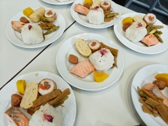 辻公邸料理人はまず初めに日本のお花見の文化について説明したのち、桜の花の塩漬けおにぎりや筍の甘辛煮など、春が旬の食材や、だし巻き玉子や鶏八幡巻きなどお弁当で定番のおかず等を